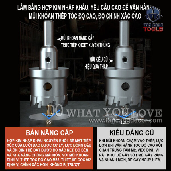 - Mũi khoan tâm vát góc 95 độ giúp định vị chính xác lỗ khoan, không bị trượt.