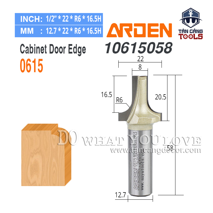 Mũi Router Arden Đánh Chỉ Cửa Tủ 8 x 16.5 x 22 mm Cốt 12.7 mm ARDEN 0615 Cabinet Door Edge Bit