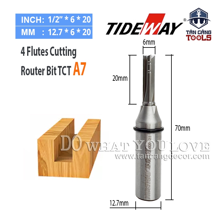 Mũi Router CNC 4 Cạnh TCT A7 Tideway 6 x 20 mm Cốt 12.7 mm