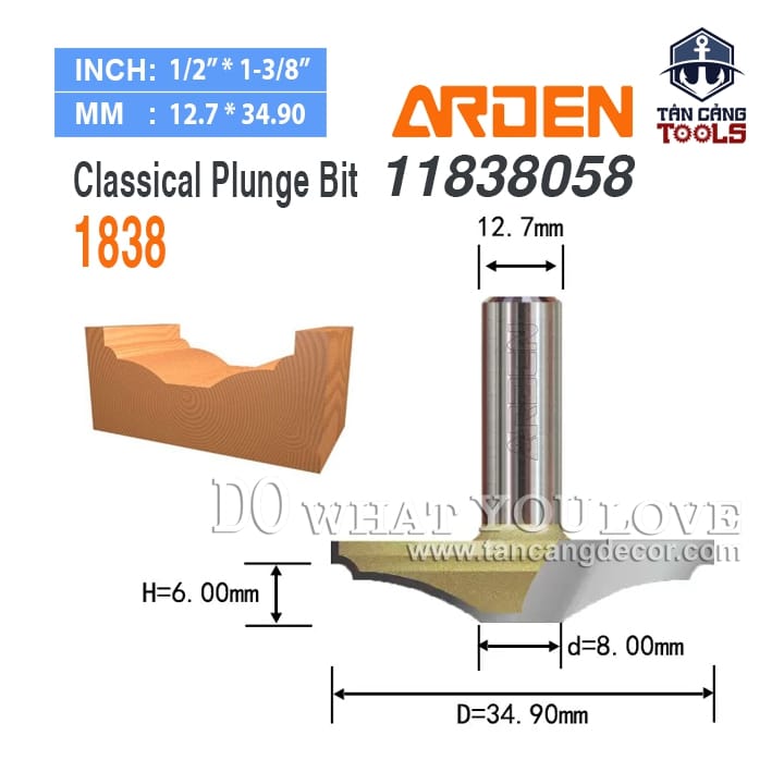 Mũi Router Đánh Pano Tủ 1838 Arden 8 x 34.9 mm Cốt 12.7 mm
