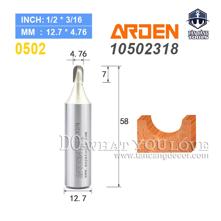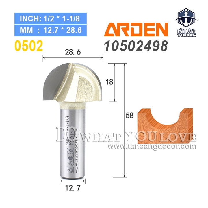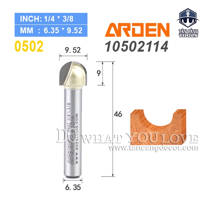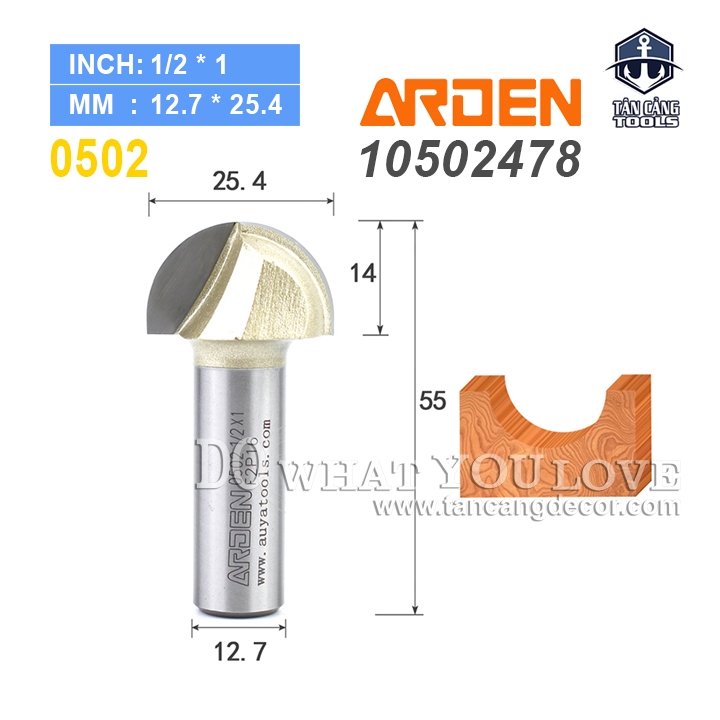 - Mũi Router Arden Đánh Rãnh Tròn Góc 6.35 mm Cốt 12.7 mm Arden 0502.
