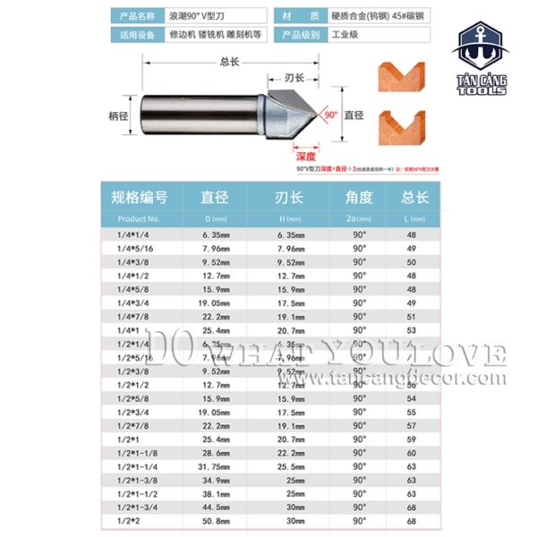 - Xem thêm các kích thước khác Mũi Router TIDEWAY Đánh Rãnh V 90 Độ tại đây: (Click vào hình ảnh để xem chi tiết)