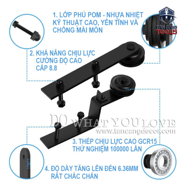 Bộ phụ kiện chưa bao gồm ray dẫn hướng. ( Có thể đặt theo yêu cầu tại Shop Tân Cảng Decor tùy vào bề rộng cửa hoặc Bạn có thể đặt mua dễ dàng ngoài tiệm sắt,yêu cầu độ dày 5mm -6mm).