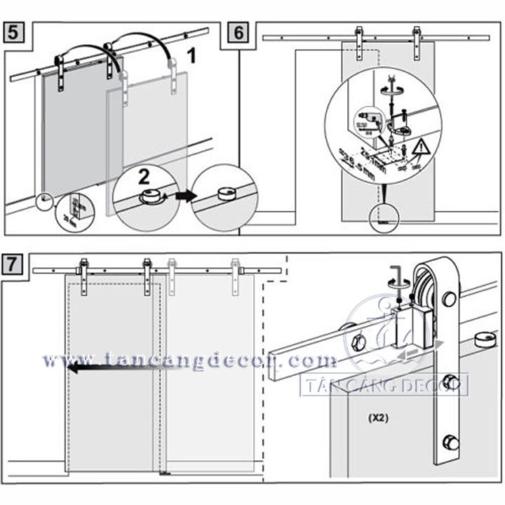 * LƯU Ý : Bộ phụ kiện chưa bao gồm ray dẫn hướng ( Có thể đặt theo yêu cầu tại Shop Tân Cảng Decor tùy vào bề rộng cửa hoặc Bạn có thể đặt mua dễ dàng ngoài tiệm sắt, yêu cầu độ dày 5mm -6mm).
