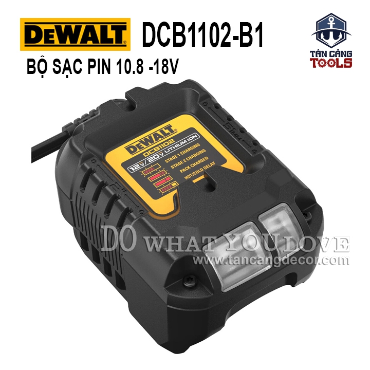 - Sạc Pin 10.8V 18V DeWalt DCB1102-B1 là loại sạc pin trụ sạc cho các dòng pin 10.8 V – 18V, phù hợp với hầu hết loại 1.5Ah, 2.0Ah, 4.0Ah. Sạc pin DeWalt có thiết kế nhỏ gọn, thời gian sạc chậm.