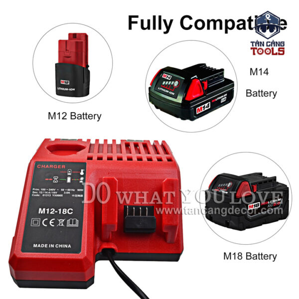 - Sạc Pin 12V 18V Milwaukee M12-18C Milwaukee C12C thích hợp các dòng pin 2.0 3.0 4.0 6.0 Ah 12V – 4.0 5.0 Ah 18V Milwaukee.