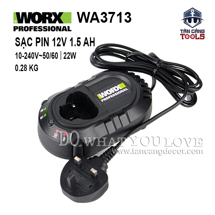 - Sạc Pin Worx WA3713 12V áp dụng cho toàn bộ dòng pin 12V của hãng WORX GREEN.
