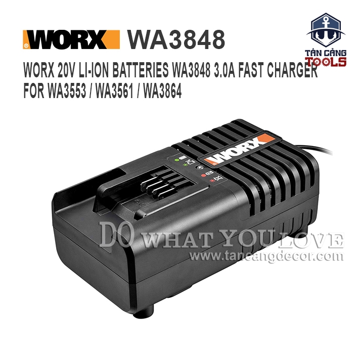 - Sạc Pin WORX WA3848 20V áp dụng cho toàn bộ dòng pin 20V 2AH và 4AH của hãng WORX.