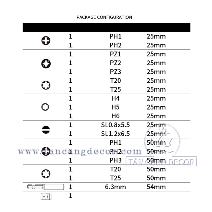 – Bộ sản phẩm bao gồm các mũi : PH, T, PZ, H, SL 1′ ( 1 inches = 25.4 mm ) + PH1 x 1 + T20 x 1