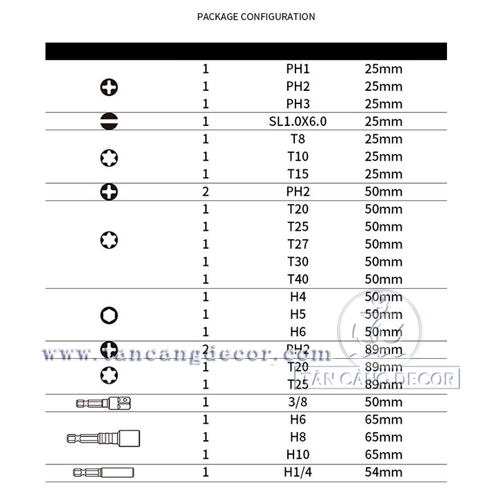 – Bộ sản phẩm bao gồm các mũi : PH, T, PZ, H, SL 1′ ( 1 inches = 25.4 mm ) + PH1 x 1 + T15 x 1