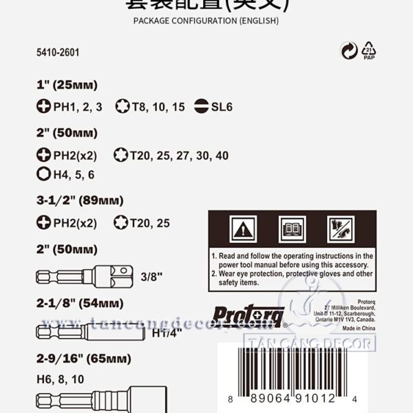 – Xuât Xứ : Trung Quốc. – Hãng : Protorq dành cho thị trường Canada. – Set 19 Món Bắt Vít ProTorq ImPact là bộ tua vít gồm 21 đầu bắt vít, 1 chuyển bulong 3/8 , 3 đầu túp H6,H8,H10, 1 đầu nối nhanh 6.3 mm