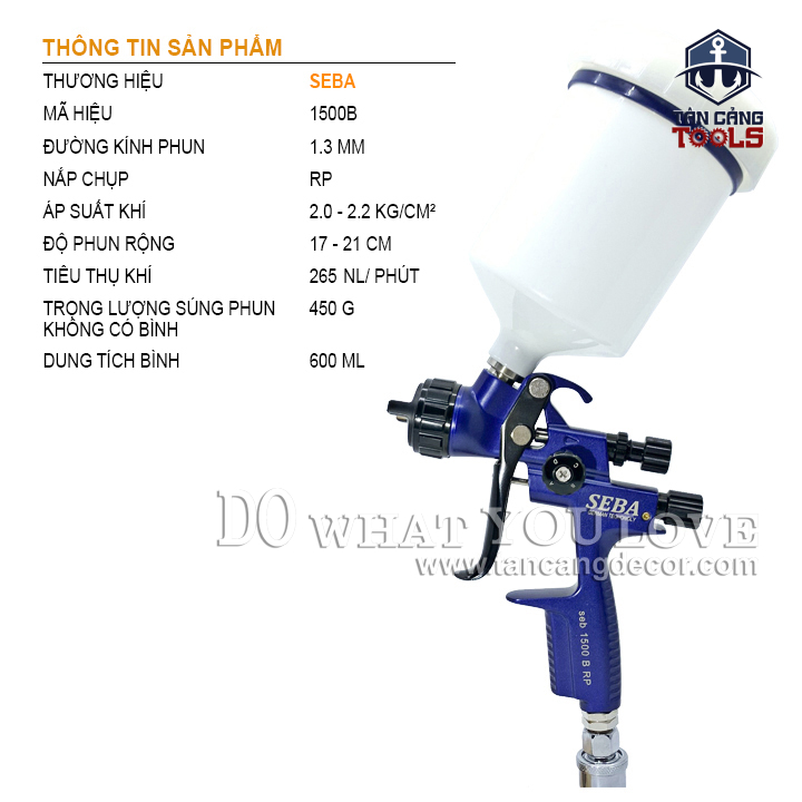 THÔNG TIN SẢN PHẨM: Thương Hiệu : SEBA Sản xuất tại Trung Quốc theo tiêu chuẩn thị trường Châu Âu Mã Sản Phẩm : 1500B – RP Chất Liệu : Hợp Kim Nhôm Phủ Niken.Đầu Phun được cấu tạo từ Đồng Nguyên Chất. Bình Chứa Nhựa Tổng Hợp Chống Bám Sơn, Dung Tích 600 ml Đầu Phun : 1.3 mm RP Theo Tiêu Chuẩn Mới Cho Sơn Ra Mịn Hơn. Biên Độ Phun : 100 – 200 ml Áp Lực Hơi Vào : 0.29 MPA. Áp Suất Phun : 2.0 – 2.2 bar. Tiêu Thụ Khí : 265 NL / Phút Khoảng Cách Phun : 10 – 20 Cm. Đầu Khí Vào 1/4 inches ( 6.35 mm ). Trọng Lượng : 450 Gram. Màu Sắc : Màu Xanh Dương BỘ SẢN PHẨM BAO GỒM: Súng Phun + Bình Chứa Trên + Cờ Lê + Dụng Cụ Vệ Sinh.