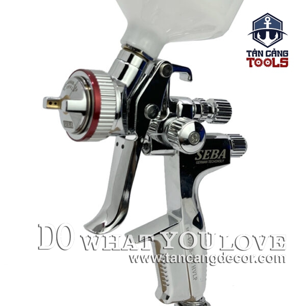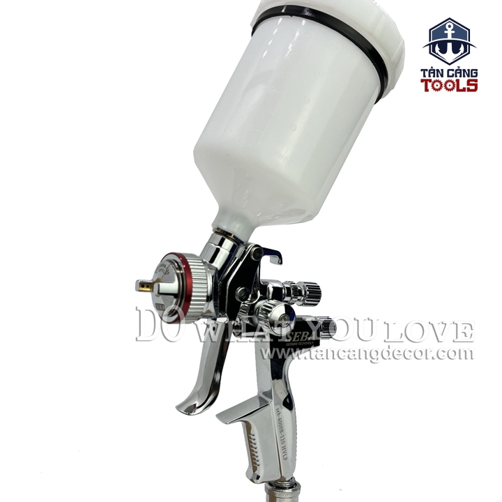 - Súng Phun Sơn Seba có dung tích bình chưa lớn cho khả năng chứa vật liệu nhiều hơn, với cơ chế bình dưới hạn chế việc chảy dung dịch khi sử dụng, đầu phun 1.3mm giúp sơn phun ra mịn hơn.