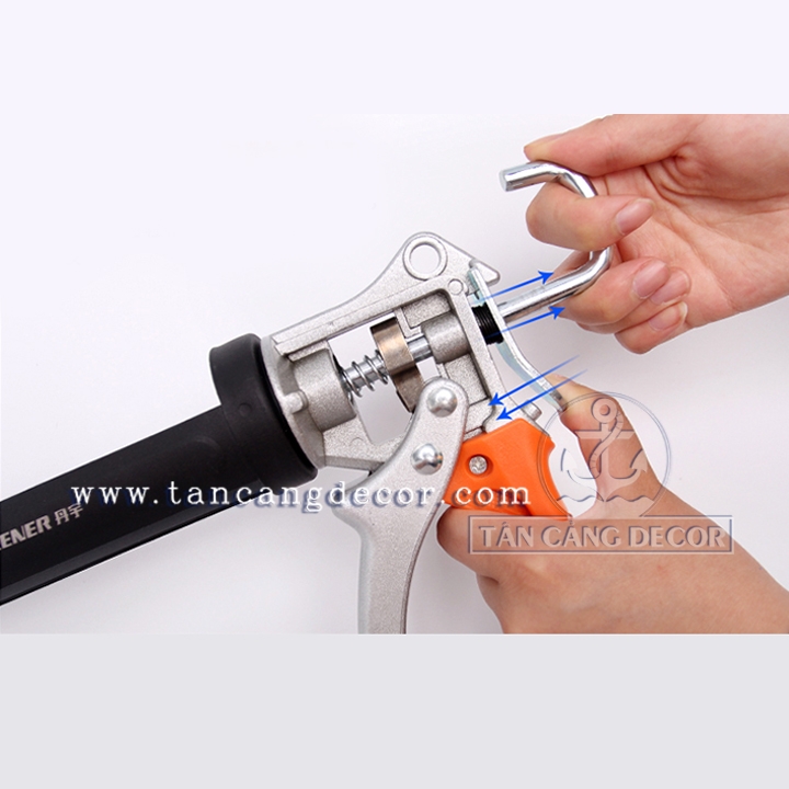- Bước 2: Mở chốt súng và kéo cần đẩy về phía sau để đặt lọ keo silicon vào bên trong thân của súng bắn keo silicon, sau đó bóp nhẹ cò súng cho tới khi cần đẩy dịch chuyển dần vào bên trong ống tuýp kéo. Hãy bóp nhẹ cò súng cho tới khi cần đẩy tiếp xúc với màng bơm. Tránh bóp súng quá mạnh nếu không keo sẽ trào ra khỏi miệng ống.
