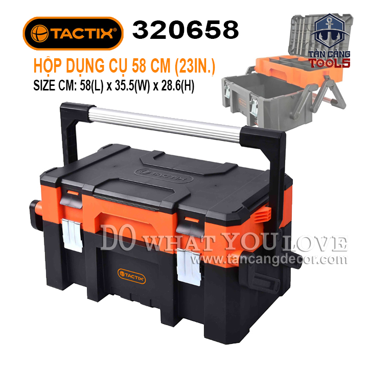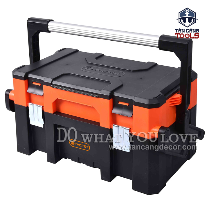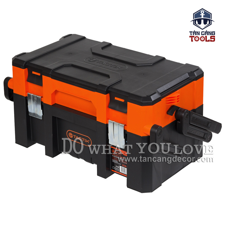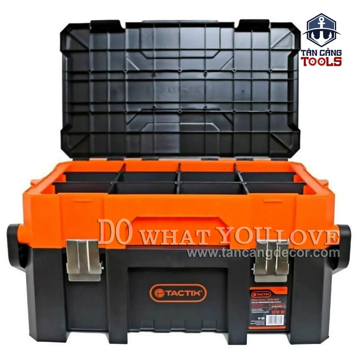 THÔNG TIN SẢN PHẨM: Thương Hiệu : TACTIX Website:http://www.tactixtools.com/ Mã Hiệu : 320358 Xuất Xứ : Trung Quốc. Màu Sắc : Màu Cam – Đen Chất Liệu : Nhựa Cứng Tổng Hợp – Tay Cầm Nhôm. Kích Thước Tủ : Ngang 580 x Rộng 355 x Cao 286 mm. Chốt Khóa Thép Chịu Lực Cao. Sản Phẩm Gồm 2 Tầng : Tầng 1 Khoang Chứa Lớn, Tầng 2 Có Thể Tháo Rời Và Chia Ô. Trọng Lượng : 4500 Gram. Mặt Đáy Đúc Liền Khối Chắc Chắn.