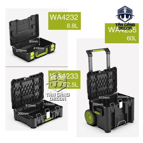 - Thùng Đựng Đồ Nghề Worx WA4234 Chuẩn IP65 mang đến sự cân bằng giữa kích thước, tải trọng và khả năng di chuyển — lý tưởng cho nhu cầu chứa nhiều dụng cụ nặng hơn so với WA4233.