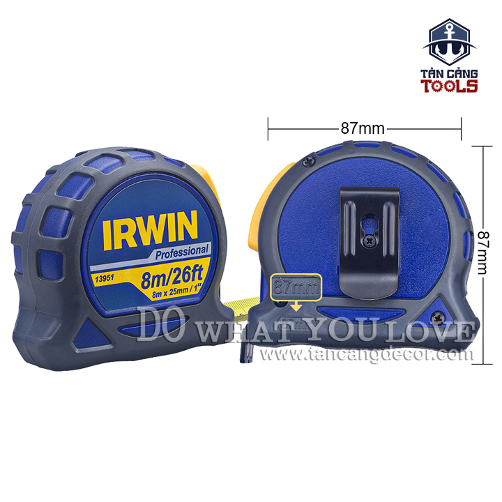 THÔNG TIN SẢN PHẨM: Thương Hiệu : IRWIN – Tiêu Chuẩn Mỹ. Xuất Xứ : Trung Quốc. Mã Sản Phẩm : 13951 Chất Liệu : Thép Chống Sỉ Rét – Được Phủ 1 Lớp Nylon mờ chống trầy sướt.Lớp vỏ được cấu tạo từ cao su chất lượng cao, thân thiện với môi trường. Chiều Dài : 8 Mét. Kích Thước Bản Thước : Bản rộng 25 mm – Độ dày 0.9 mm. Kích Thước Vỏ : 87 x 87 x 42 mm Trọng Lượng : 160 Gram. Khóa Thước Dạng Bấm. Sử Dụng Hệ Cm / Inches 2 Mặt. Cấp chính xác Class II Đơn Giá Bán 1 Cái.