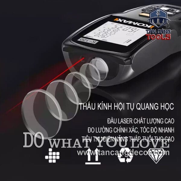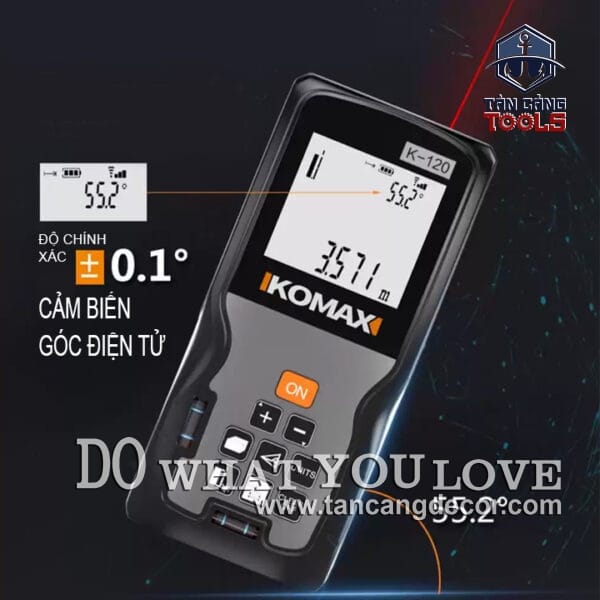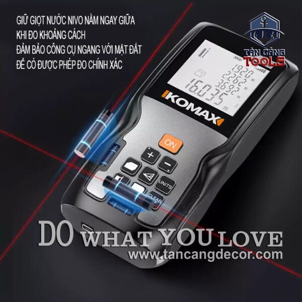 - Thước Đo Khoảng Cách Điện Tử 50 Mét Komax K-50 với tính năng chính là đo khoảng cách lên đến 50 m, đo diện tích, đo thể tích, đo chiều cao vật thể với các cơ chế chọn vị trí điểm đầu hoặc điểm cuối của máy đo.