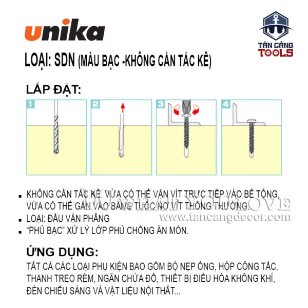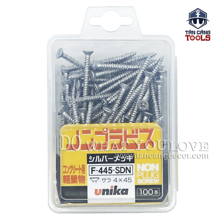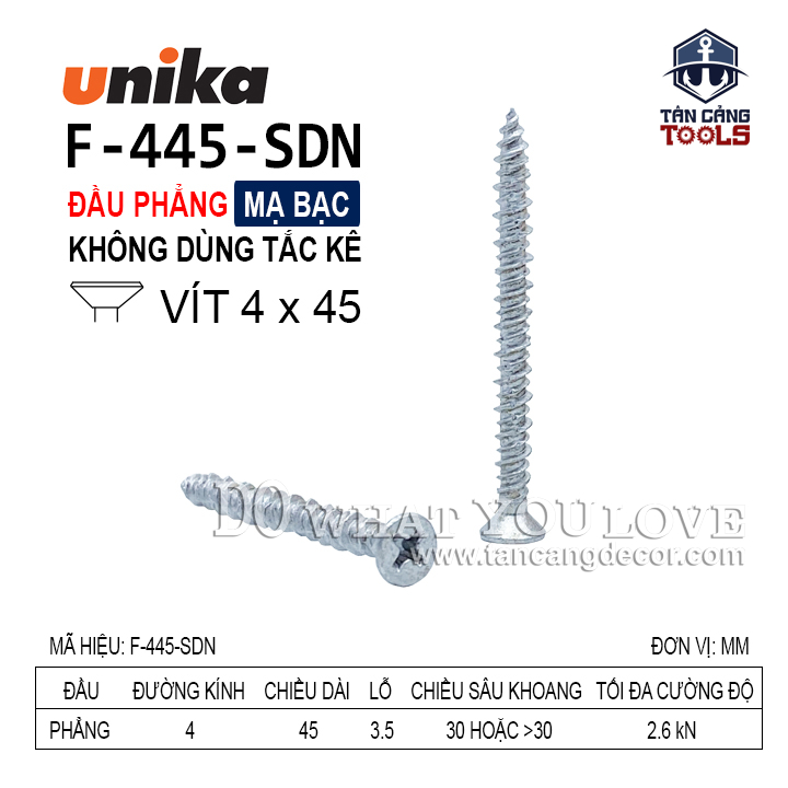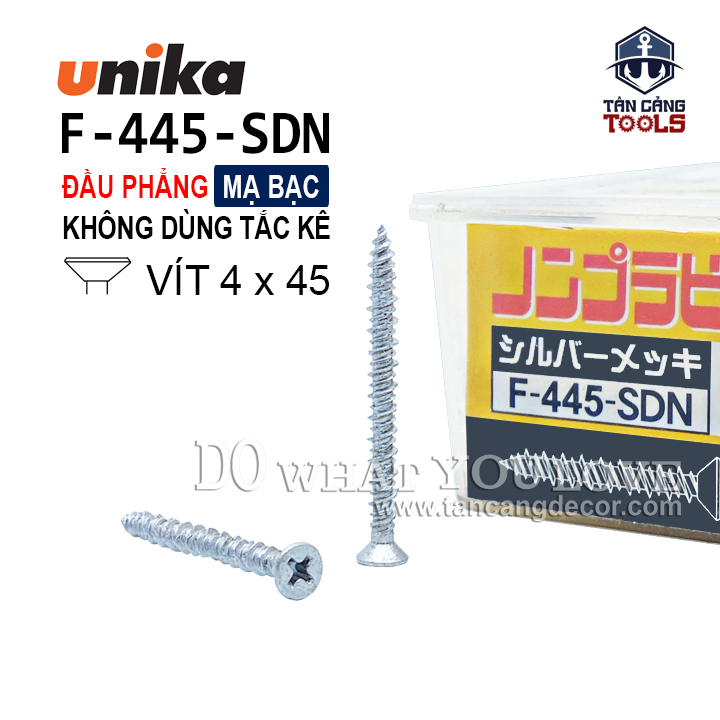 THÔNG TIN SẢN PHẨM: Xuất Xứ : Việt Nam Thương Hiệu : UNIKA – Hàng Chính Hãng. Mã Hiệu : F445 – SDN Chất Liệu : Thép Cứng Mạ Bạc Chống Rỉ. Kích Thước : 4 x 45 mm ( Như Hình Vẽ ) Đơn giá bán 1 Hộp 100 Cái. Ngoài ra, còn có nhiều kích cỡ vít khác nhau và mỗi cỡ vít sẽ có quy cách đóng gói số lượng tương ứng.